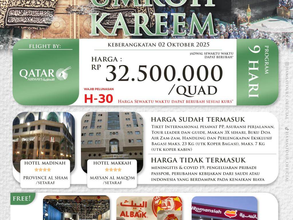 - Perlengkapan : koper bagasi, tas ransel, kain ihram/mukena, buku manasik, kain seragam, syal, & sabuk